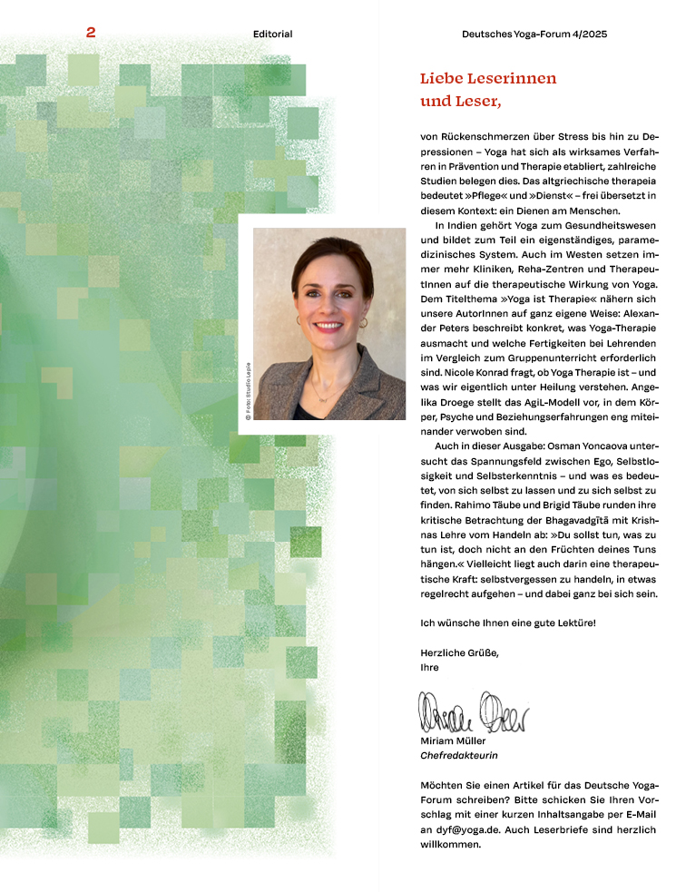 Mein neues Editorial zu „Yoga ist Therapie“ im Deutschen Yoga Forum 4_2025 des BDY von Miriam | Sep. 3, 2025 | Yoga Philosophie | 0 Kommentare Mit dem Titelthema unserer neuen Ausgabe „Yoga ist Therapie“ stellen wir dar, wie heilsam die Yoga-Praxis wirken kann. Kommentar absenden Antwort abbrechenDeine E-Mail-Adresse wird nicht veröffentlicht. Erforderliche Felder sind mit * markiertKommentar * Name * E-Mail * Website Meinen Namen, meine E-Mail-Adresse und meine Website in diesem Browser für die nächste Kommentierung speichern.
