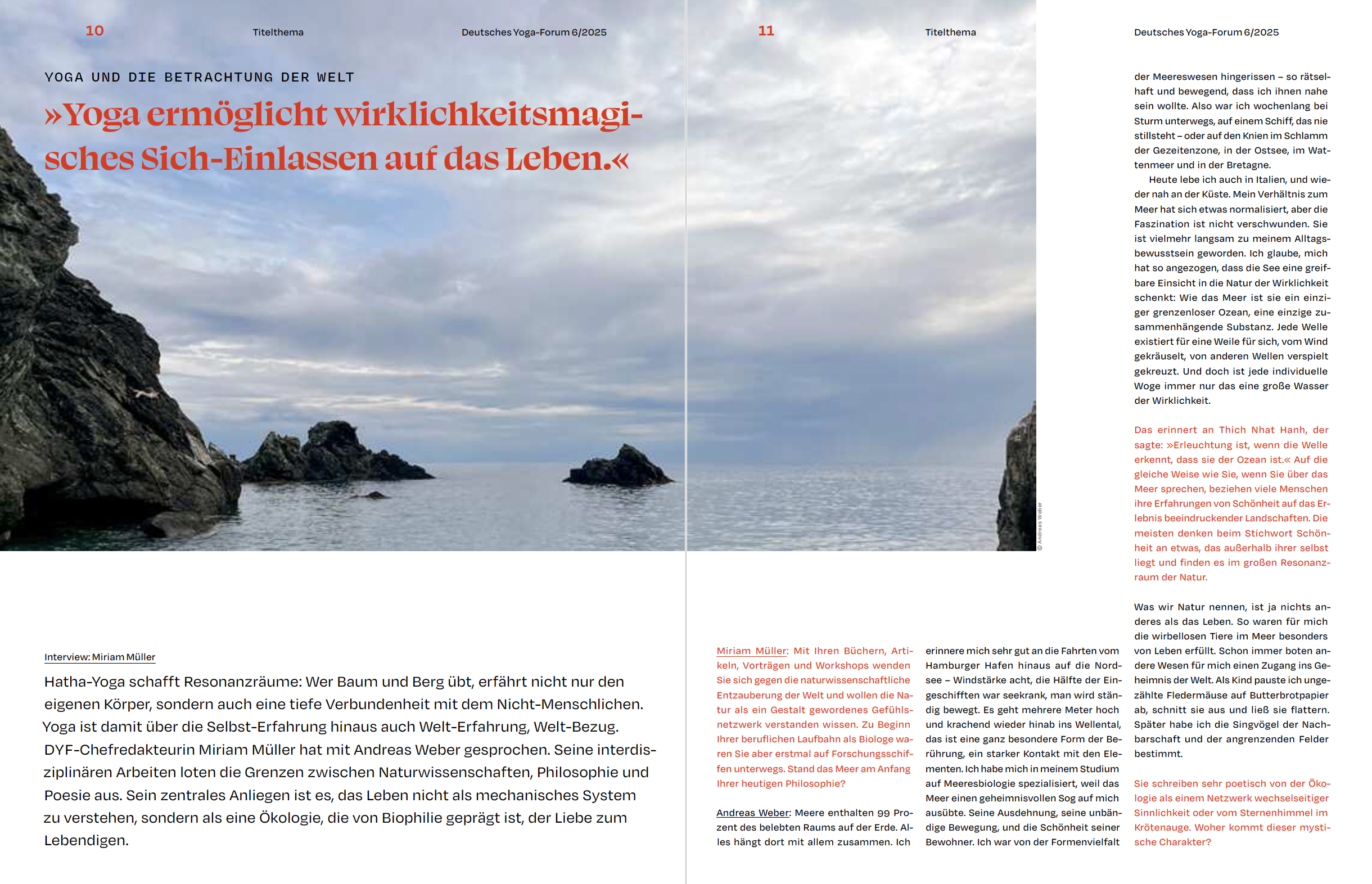 Hatha-Yoga schafft Resonanzräume: Wer Baum und Berg übt, erfährt nicht nur den eigenen Körper, sondern auch eine tiefe Verbundenheit mit dem Nicht-Menschlichen. Yoga ist damit über die Selbst-Erfahrung hinaus auch Welt-Erfahrung, Welt-Bezug. DYF-Chefredakteurin Miriam Müller hat mit Andreas Weber gesprochen. Seine interdisziplinären Arbeiten loten die Grenzen zwischen Naturwissenschaften, Philosophie und Poesie aus. Sein zentrales Anliegen ist es, das Leben nicht als mechanisches System zu verstehen, sondern als eine Ökologie, die von Biophilie geprägt ist, der Liebe zum Lebendigen.